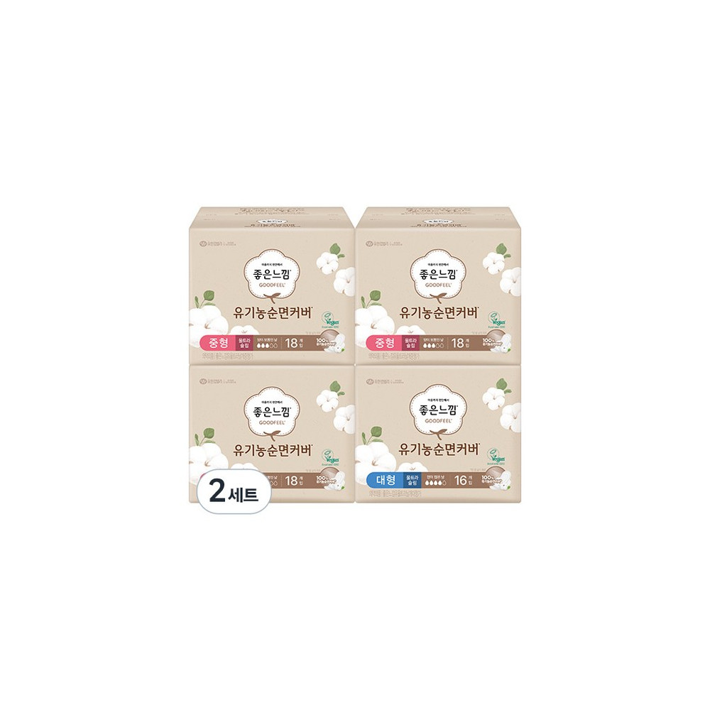 좋은느낌 유기농 순면커버 울트라 날개 생리대 날개형 중형 18p x 3팩 + 대형 16p, 2세트